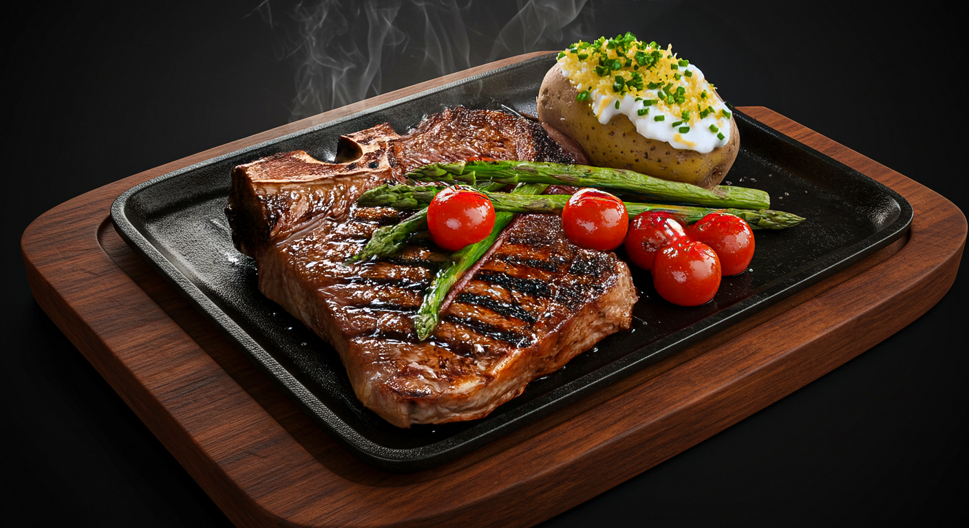 Juicy, rich New York steak served with baked potato, grilled asparagus, and cherry tomatoes
